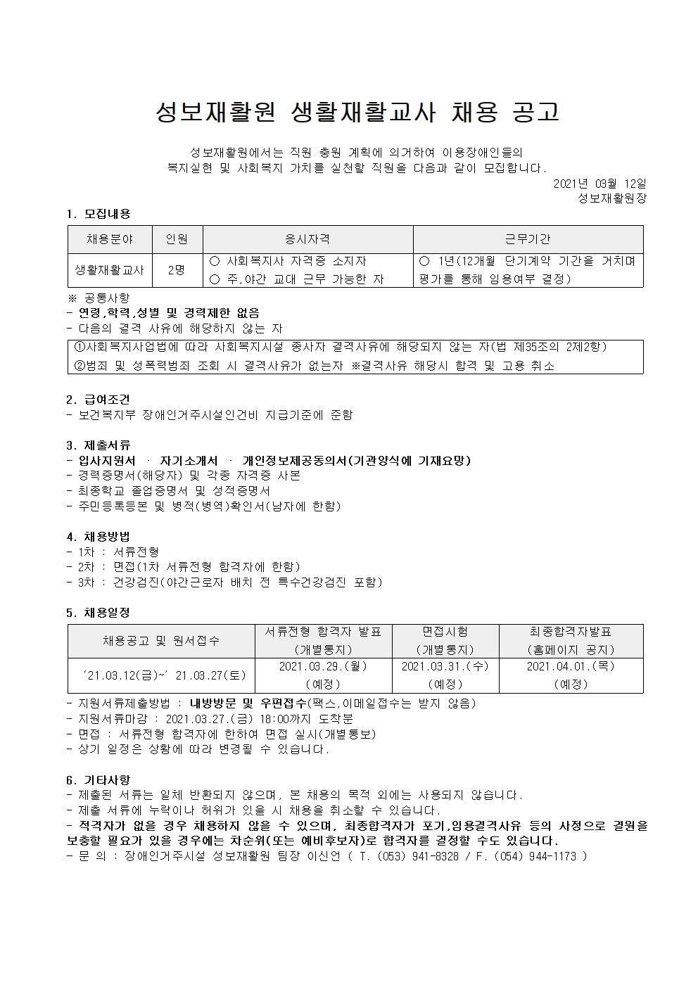 성보재활원 육아휴직 대체인력 생활재활교사 채용 공고 결과 발표