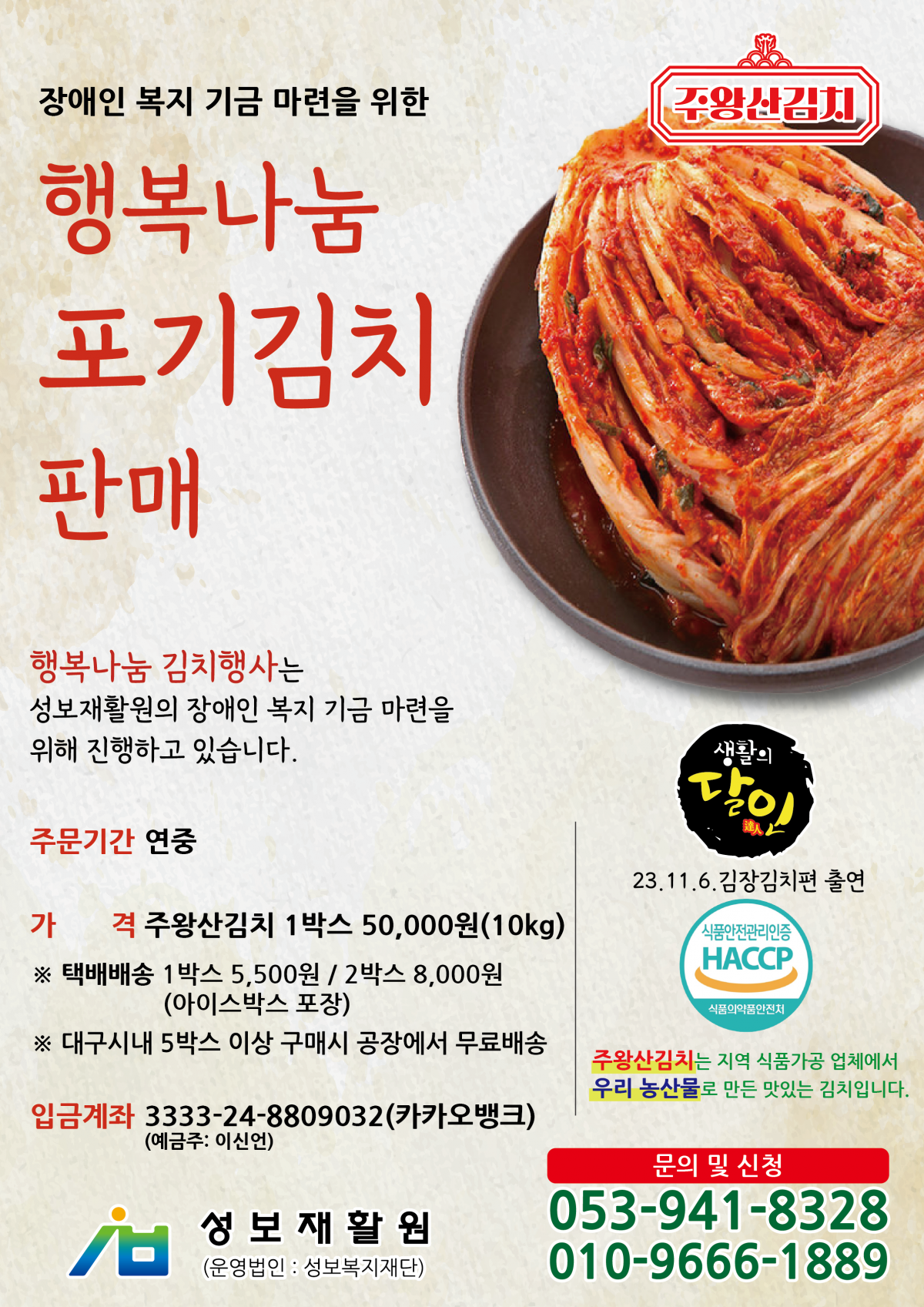 성보재활원 행복나눔 김치 판매 안내 사회복지법인성보재활원 0 821 2024.11.18 10:19 안녕하세요 성보재활원에서는 장애인복지기금마련을 위한 행복나눔 포기김치 판매를 시작하였습니다.지역 식품가공업체인 주왕산김치에서 우리농산물로 만든 맛있는 포기김치!!1박스(10kg) 50,000원입니다.배송은 택배로 하며 1박스는 5,500원 2박스는 8,000원을 받고 있습니다.또한 대구시내 5박스 이상구매시 김치업체에서 무료로 직접 배송해드립니다.맛있는 김치, 많이 구입바랍니다^^감사합니다.