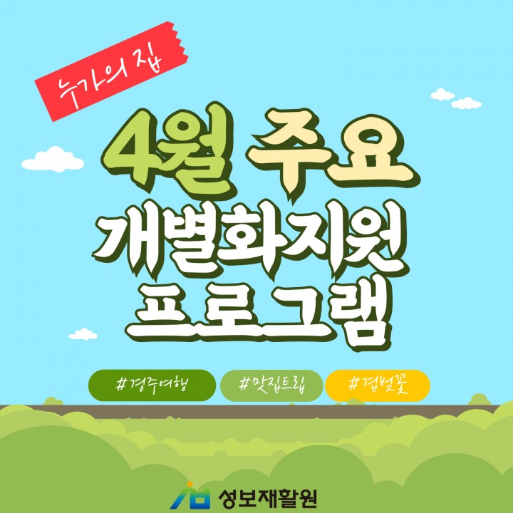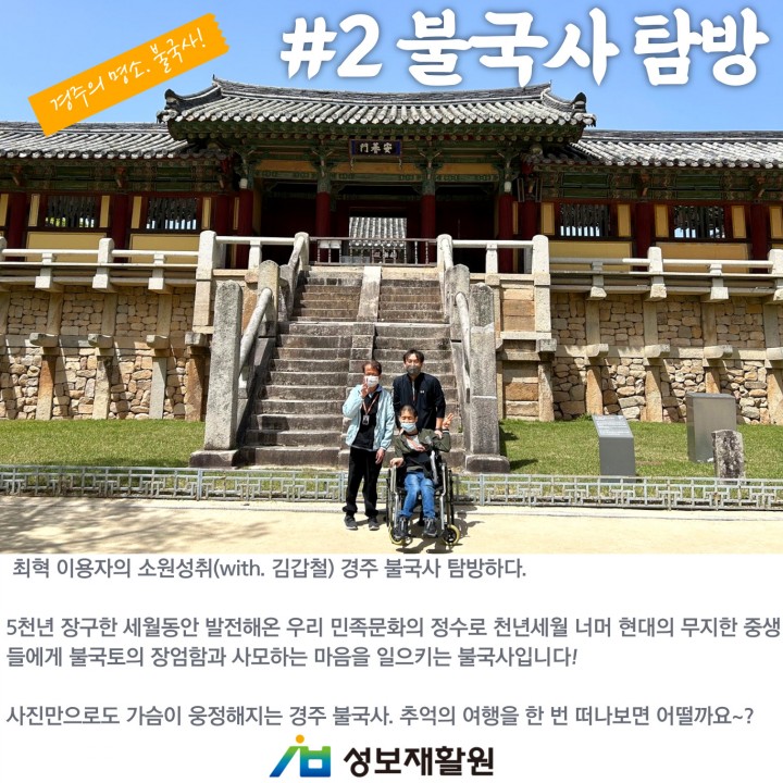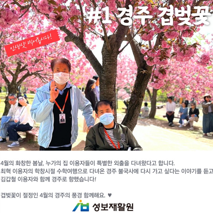 가고싶은 곳은 가자! 누가의집 4월 주요 개별화지원프로그램 담당자 0 1485 2024.05.08 10:41 가고싶은 곳은 가자! 누가의집 4월 주요 개별화지원프로그램성보재활원은 이용자들에게 개별화 지원 프로그램을 통해서 욕구를 충족시키고 지역사회의 일원으로서 행복한 삶을 누릴 수 있도록 지원 중에 있습니다.수학여행 추억을 되살리며 다시 방문한 경주 불국사, 4월 주요 개별화지원프로그램 한 번 살펴보아요.