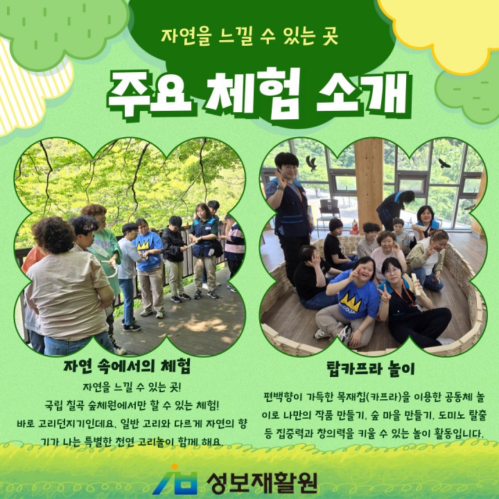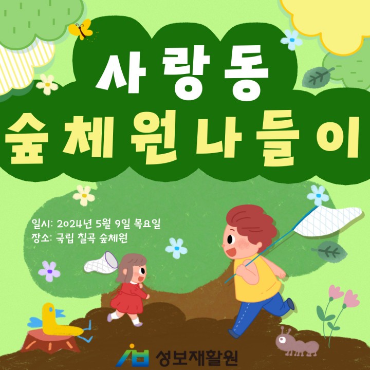 사랑동 숲체원 나들이 담당자 0 1047 2024.05.29 15:36 함께해서 행복한 성보재활원입니다.사랑동 숲체원 나들이일시: 2024년 5월 9일 목요일장소: 국립 칠곡 숲체원지난 5월 9일, 사랑동 이용자들과 직원들이 함께 국립칠곡숲체원을 다녀왔습니다! 자연과 어울려 다양한 체험과 더불어 휴식까지! 즐기고 왔습니다.화창한 날씨 덕분에 모든 것이 완벽했다고 합니다. 잠시 일상생활을 내려놓고 자연 속에서 힐링을 하고 온 사랑동!함께 구경해보아요.