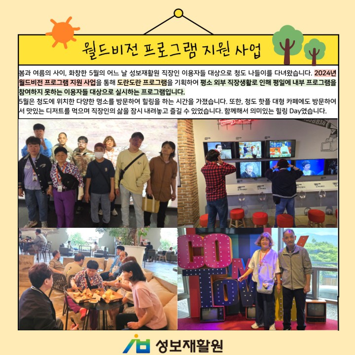 봄과 여름의 사이, 화창한 5월의 어느 날 성보재활원 직장인 이용자들 대상으로 청도 나들이를 다녀왔습니다. 2024년 월드비전 프로그램 지원 사업을 통해 도란도란 프로그램을 기획하여 평소 외부 직장생활로 인해 평일에 내부 프로그램을 참여하지 못하는 이용자들 대상으로 실시하는 프로그램입니다.