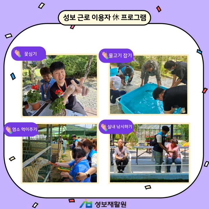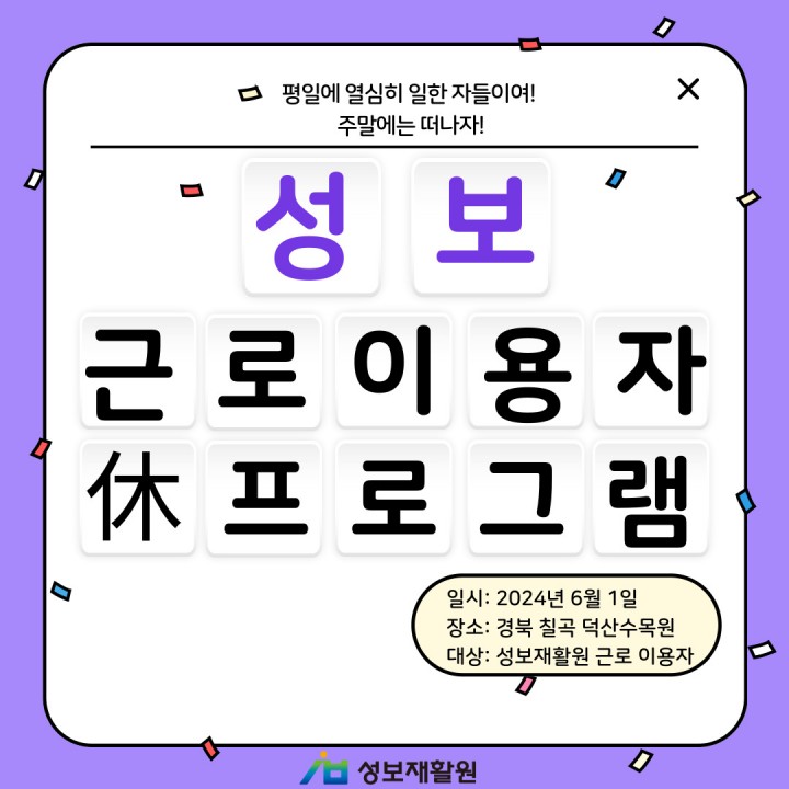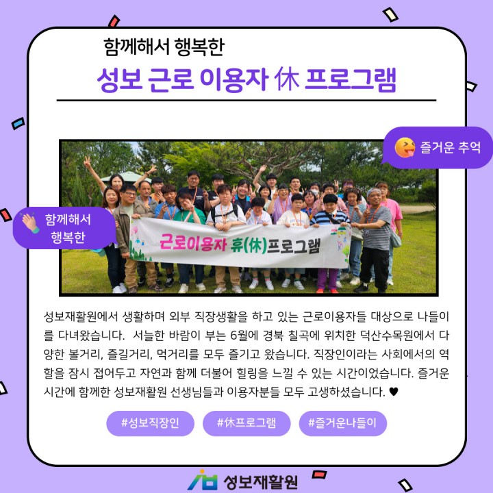 성보 근로 이용자 休프로그램 담당자 0 970 2024.06.18 14:11 -일시: 2024년 6월 1일-장소: 경북 칠곡 덕산수목원-대상: 성보재활원 근로 이용자성보재활원에서 생활하며 외부 직장생활을 하고 있는 근로이용자들 대상으로 나들이를 다녀왔습니다. 서늘한 바람이 부는 6월에 경북 칠곡에 위치한 덕산수목원에서 다양한 볼거리, 즐길거리, 먹거리를 모두 즐기고 왔습니다. 직장인이라는 사회에서의 역할을 잠시 접어두고 자연과 함께 더불어 힐링을 느낄 수 있는 시간이었습니다. 즐거운 시간에 함께한 성보재활원 선생님들과 이용자분들 모두 고생하셨습니다. ♥