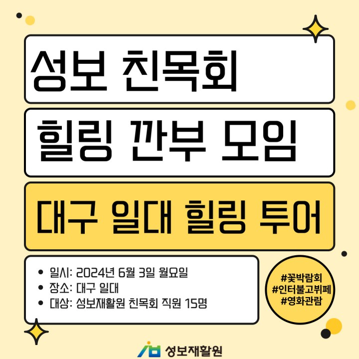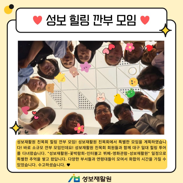성보 친목회 힐링 깐부 모임 담당자 0 1153 2024.06.18 14:11 -일시: 2024년 6월 3일 월요일-장소: 대구 일대-대상: 성보재활원 친목회 직원 15명성보재활원 친목회 힐링 깐부 모임! 성보재활원 친목회에서 특별한 모임을 계획하였습니다! 바로 소규모 깐부 모임인데요! 성보재활원 친목회 회원들과 함께 대구 일대 힐링 투어를 다녀왔습니다. "성보재활원-꽃박람회-인터불고 뷔페-영화관람-성보재활원" 일정으로 특별한 추억을 쌓고 왔답니다. 다양한 부서들과 연령대들이 모여서 화합의 시간을 가질 수 있었습니다. 수고하셨습니다. ♥