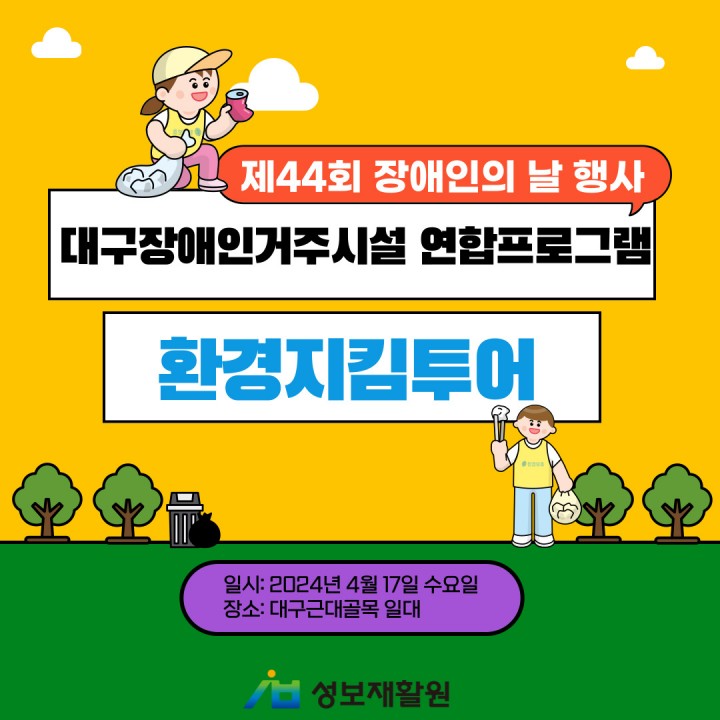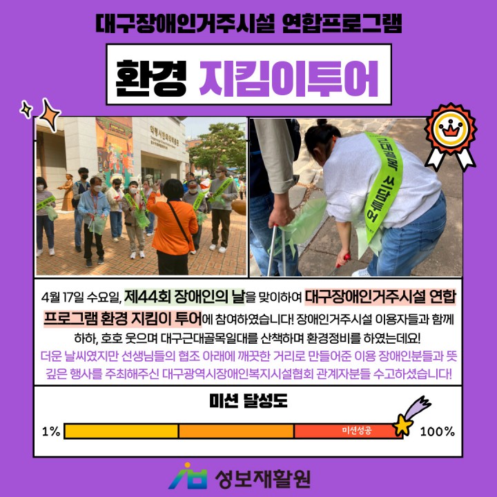 제44회 장애인의 날 행사 대구장애인거주시설 연합프로그램 환경지킴투어 담당자 0 1373 2024.04.18 16:26 제44회 장애인의 날 행사 대구장애인거주시설 연합프로그램 환경지킴투어- 일시: 2024년 4월 17일 수요일- 장소: 대구근대골목 일대4월 17일 수요일, 제44회 장애인의 날을 맞이하여 대구장애인거주시설 연합프로그램 환경 지킴이 투어에 참여하였습니다! 장애인거주시설 이용자들과 함께 하하, 호호 웃으며 대구근대골목일대를 산책하며 환경정비를 하였는데요!더운 날씨였지만 선생님들의 협조 아래에 깨끗한 거리로 만들어준 이용 장애인분들과 뜻깊은 행사를 주최해주신 대구광역시장애인복지시설협회 관계자분들 수고하셨습니다!