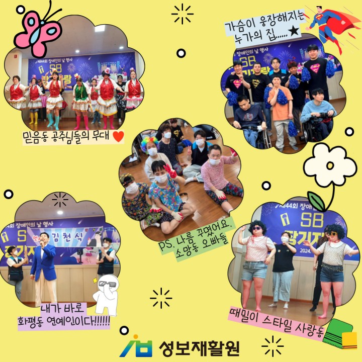 4월 19일 금요일, 제44회 장애인의 날을 맞이하여 2부 오후 행사인 SB장기자랑 행사가 열렸어요! 생활관 이용자들과 직원들이 모여서 다양한 재주를 뽐내며 즐거운 시간을 보냈답니다. 제일 중요한 경품은 성령불꽃선교단에서 후원해주셨답니다.