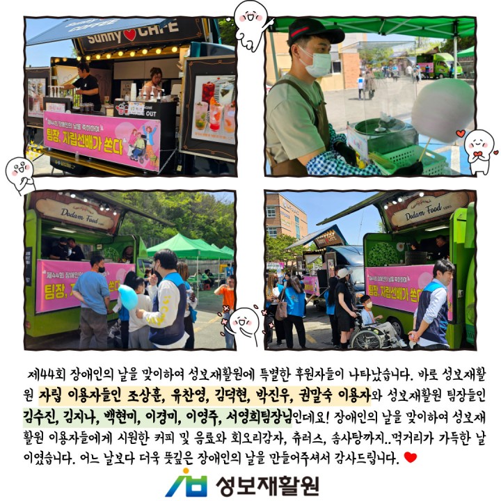 장애인의 날을 맞이하여 성보재활원 이용자들에게 시원한 커피 및 음료와 회오리감자, 츄러스, 솜사탕까지..먹거리가 가득한 날이였습니다.