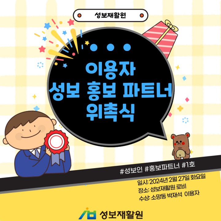 박재석이용자 성보 홍보 파트너 위촉식 담당자 0 1119 2024.02.28 16:35 함께해서 행복한 성보재활원입니다.박재석이용자 성보 홍보 파트너 위촉식일시: 2024년 2월 27일 화요일장소: 성보재활원 로비수상: 소망동 박재석 이용자성보재활원 이용자 최초 홍포 파트너 위촉식을 진행하였습니다.바로 소망동 박재석이용자인데요, 박재석이용자는 원내 행사 참여를 하는 등 다양한 활동을 하며 생활 중에 있습니다. 앞으로도 성보재활원을 위하여 꾸준한 활동을 부탁드립니다.