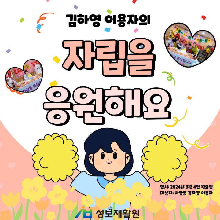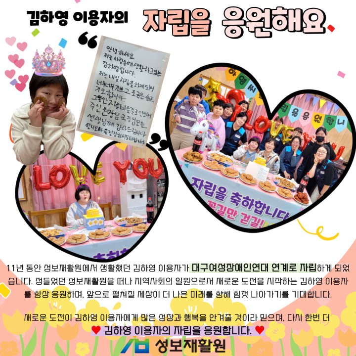 김하영 이용자의 자립을 응원해요! 담당자 0 1334 2024.03.05 15:43 김하영 이용자의 자립을 응원해요!일시: 2024년 3월 4일 월요일대상자: 사랑동 김하영 이용자11년 동안 성보재활원에서 생활했던 김하영 이용자가 대구여성장애인연대 연계로 자립하게 되었습니다. 정들었던 성보재활원을 떠나 지역사회의 일원으로서 새로운 도전을 시작하는 김하영 이용자를 항상 응원하며, 앞으로 펼쳐질 세상이 더 나은 미래를 향해 힘껏 나아가기를 기대합니다.새로운 도전이 김하영 이용자에게 많은 성장과 행복을 안겨줄 것이라 믿으며, 다시 한번 더 ♥ 김하영 이용자의 자립을 응원합니다. ♥