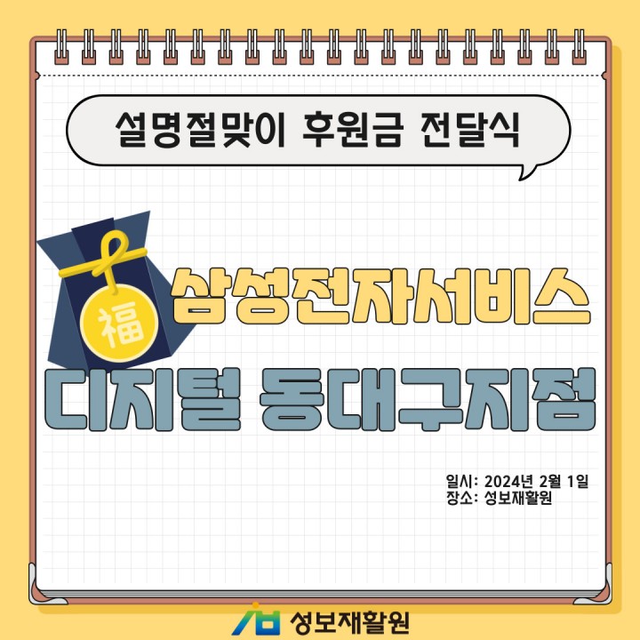 삼성전자서비스 디지털 동대구지점 설명절맞이 후원금 전달식 담당자 0 1402 2024.02.06 18:06 삼성전자서비스 디지털 동대구지점 설명절맞이 후원금 전달식-일시: 2024년 2월 1일-장소: 성보재활원작년에 이어서 삼성전자서비스 디지털 동대구센터 직원본들께서 성보재활원을 방문해주셨습니다. 직원분들께서 직접 버신 소중한 금액으로 후원해주셔서 의미가 있는 후원이 아닐까합니다. 성보재활원 이용자들에게 도움이 되도록 투명하게 사용하겠습니다.감사드립니다. ♥