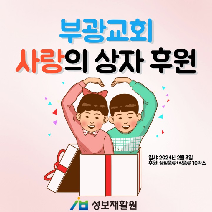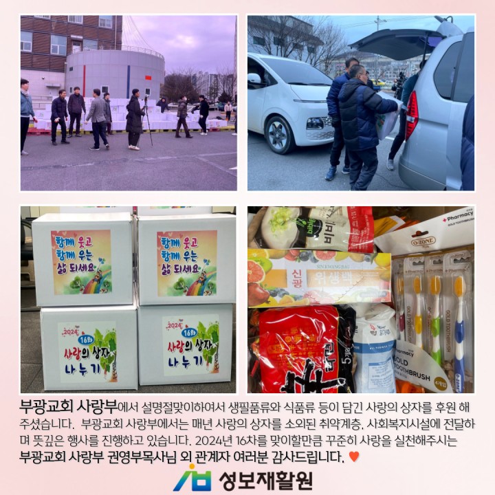 부광교회 사랑의 상자 후원 담당자 0 1157 2024.02.06 18:08 부광교회 사랑의 상자 후원-일시: 2024년 2월 3일-후원: 생필품류+식품류 10박스부광교회 사랑부에서 설명절맞이하여서 생필품류와 식품류 등이 담긴 사랑의 상자를 후원 해주셨습니다.부광교회 사랑부에서는 매년 사랑의 상자를 소외된 취약계층, 사회복지시설에 전달하며 뜻깊은 행사를 진행하고 있습니다.2024년 16차를 맞이할만큼 꾸준히 사랑을 실천해주시는 부광교회 사랑부 권영부목사님 외 관계자 여러분 감사드립니다. ♥