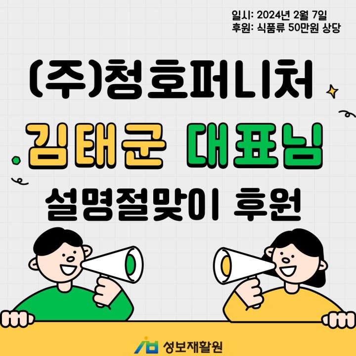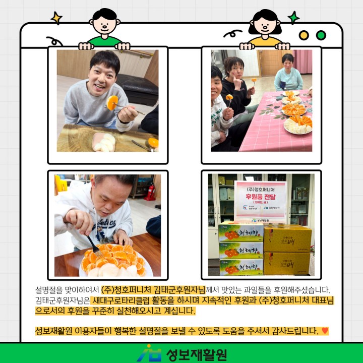 (주)청호퍼니처 김태군대표님 설명절맞이 후원 담당자 0 1121 2024.02.13 09:40 (주)청호퍼니처 김태군대표님 설명절맞이 후원-일시: 2024년 2월 7일-후원: 식품류 50만원 상당설명절을 맞이하여서 (주)청호퍼니처 김태군후원자님께서 맛있는 과일들을 후원해주셨습니다.김태군후원자님은 새대구로타리클럽 활동을 하시며 지속적인 후원과 (주)청호퍼니처 대표님으로서의 후원을 꾸준히 실천해오시고 계십니다.성보재활원 이용자들이 행복한 설명절을 보낼 수 있도록 도움을 주셔서 감사드립니다. ♥