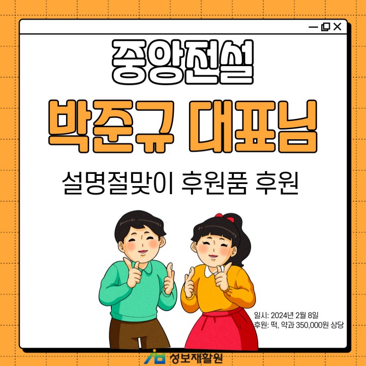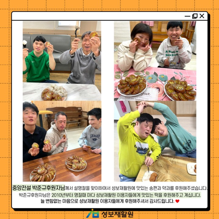 중앙전설 박준규 대표님 설명절맞이 후원품 후원 담당자 0 1312 2024.02.13 09:41 중앙전설 박준규 대표님설명절맞이 후원품 후원-일시: 2024년 2월 8일-후원: 떡, 약과 350,000원 상당중앙전설 박준규후원자님께서 설명절을 맞이하여서 성보재활원에 맛있는 송편과 약과를 후원해주셨습니다. 박준규후원자님은 2010년부터 명절때 마다 성보재활원 이용자들에게 맛있는 떡을 후원해주고 계십니다.늘 변함없는 마음으로 성보재활원 이용자들에게 후원해주셔서 감사드립니다. ♥