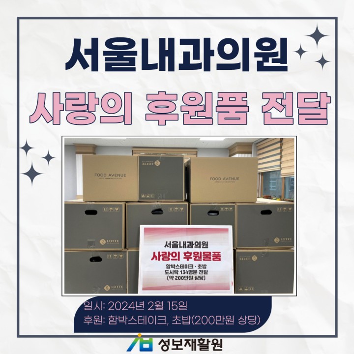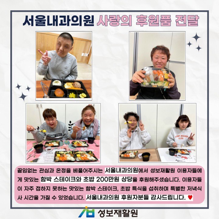 서울내과의원 사랑의 후원품 전달 담당자 0 1511 2024.02.22 16:36 함께해서 행복한 성보재활원입니다.서울내과의원 사랑의 후원품 전달 - 일시: 2024년 2월 15일- 후원: 함박스테이크, 초밥 200만원 상당끝임없는 관심과 온정을 베풀어주시는 서울내과의원에서 성보재활원 이용자들에게 맛있는 함박 스테이크와 초밥 200만원 상당을 후원해주셨습니다.이용자들이 자주 접하지 못하는 맛있는 함박 스테이크, 초밥 특식을 섭취하며 특별한 저녁식사 시간을 가질 수 있었습니다.서울내과의원 후원자분들 감사드립니다. ♥