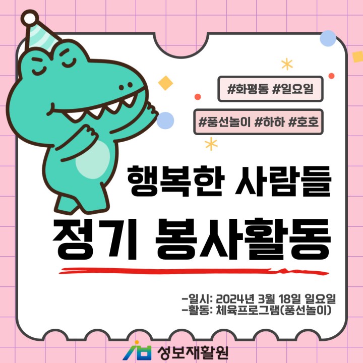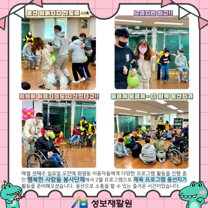 행복한 사람들 정기 봉사활동 담당자 0 1527 2024.02.22 16:37 함께해서 행복한 성보재활원입니다.행복한 사람들 정기 봉사활동-일시: 2024년 3월 18일 일요일-활동: 체육프로그램(풍선놀이)매월 셋째주 일요일 오전에 화평동 이용자들에게 다양한 프로그램 활동을 진행 중인 행복한 사람들 봉사단체에서 2월 프로그램으로 체육 프로그램 풍선치기 활동을 준비해오셨습니다.풍선으로 소통을 할 수 있는 즐거운 시간이었습니다.