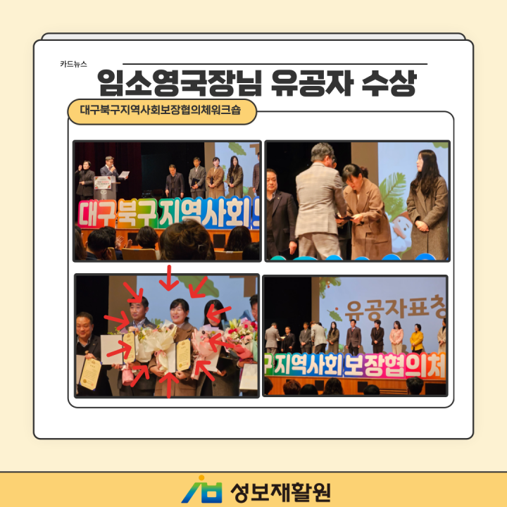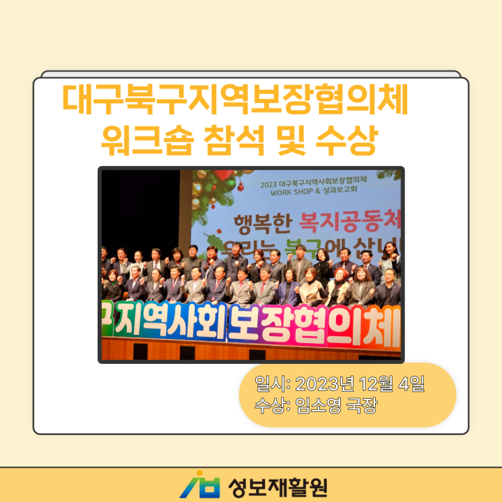 대구북구지역보장협의체 워크숍 참석 및 수상 담당자 0 1338 2023.12.22 09:50 대구북구지역보장협의체 워크숍 참석 및 수상- 일시: 2023년 12월 4일 (월)- 수상: 임소영 국장지난 12월 4일 성보재활원이 대구북구지역사회보장협의체워크숍에 참석하였습니다. 또한, 임소영국장님께서 유공차표창을 하였습니다. 축하드립니다.