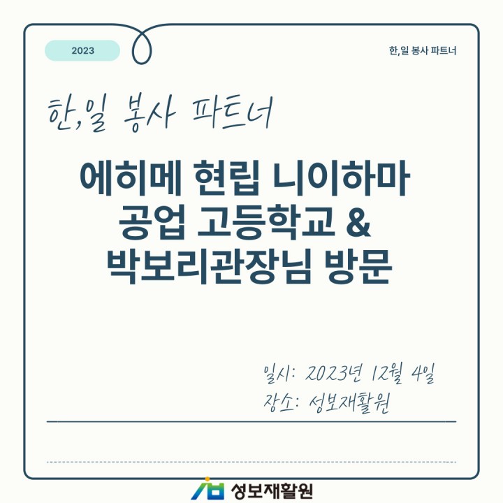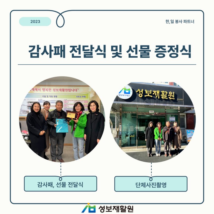 한,일 봉사 파트너 에히메 현립 니이하마 공업고등학교, 박보리관장님 방문 담당자 0 1331 2023.12.22 09:52 한,일 봉사 파트너에히메 현립 니이하마 공업고등학교, 박보리관장님 방문-일시: 2023년 12월 4일-장소: 성보재활원10년 이상 한,일 봉사 파트너를 맺고 있던 에히메 현립 니이하마 공업고등학교, 박보리관장님께서 성보재활원을 방문해주셨습니다.지난 날을 추억하며 감사패 전달과 선물 증정식을 가졌습니다.감사합니다.