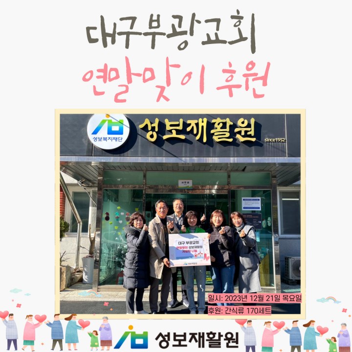 대구부광교회 연말맞이 후원 담당자 0 1871 2023.12.22 09:56 대구부광교회 연말맞이 후원-일시: 2023년 12월 21일 목요일-후원: 간식류 170세트대구부광교회 사랑부에서 연말맞이 후원을 해주셨습니다.성보재활원 이용자들에게 따뜻한 나눔을 해주신 권영부 목사님 외 후원자님들 감사드립니다.