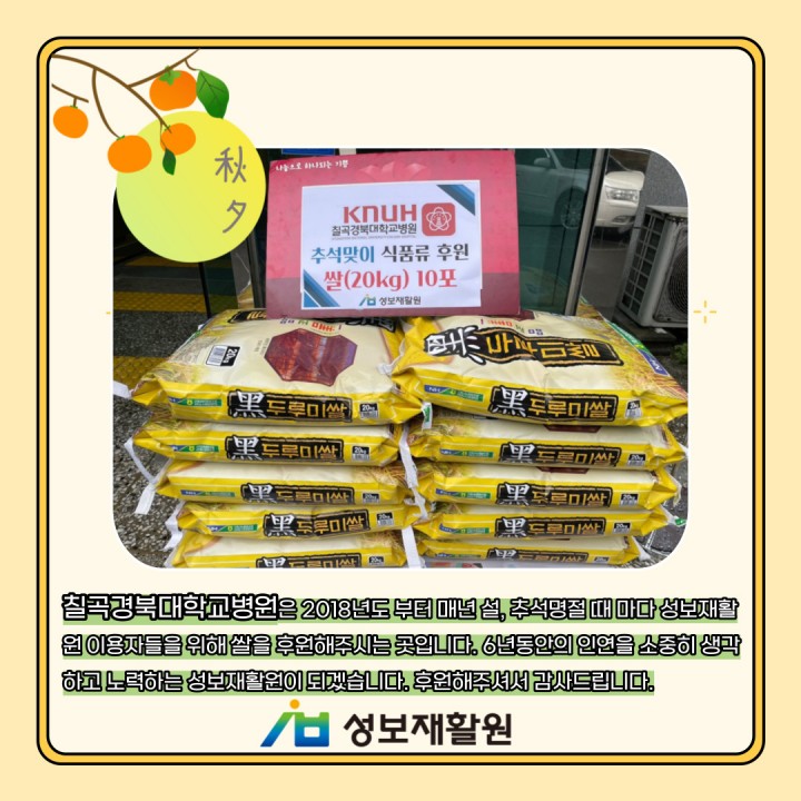 칠곡경북대학교병원은 2018년도부터 매년 설, 추석 명절 때마다 성보재활원 이용자들을 위해 쌀을 후원해 주시는 곳입니다.