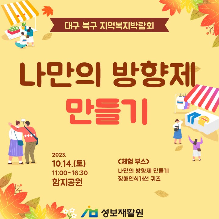 대구 북구 지역복지박람회 참여 담당자 0 1462 2023.11.02 11:50 대구 북구 지역복지박람회 참여일시: 2023년 10월 14일 (토)장소: 함지공원성보재활원이 대구 북구 지역복지박람회에 참여하였습니다.올해는 나만의 방향제 만들기 부스를 운영하였는데요!언제나 많은 분들이 부스를 찾아주셔서 감사드립니다.