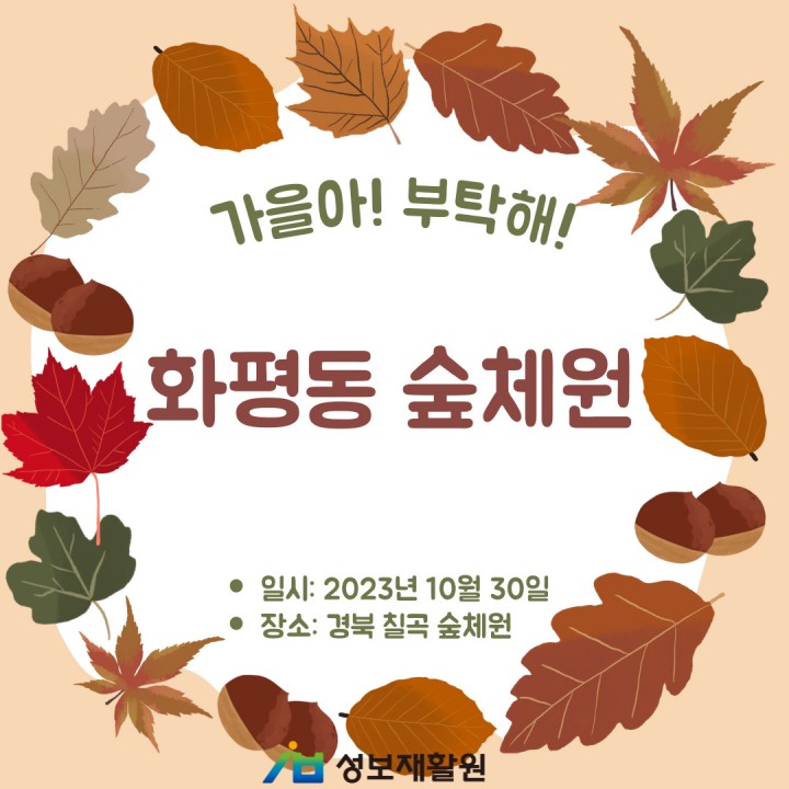 경북 칠곡 숲체원 담당자 0 1242 2023.12.22 09:44 가을의 계절을 온전히 느낄 수 있는 곳. 바로 경북 칠곡 숲체원!10월 30일, 화평동 이용자들과 직원들이 함께 다녀왔습니다.넓은 호수가의 산책로 산책과 냄새만 맡아도 건강해지는 편백나무를 활용한 게임 등 다양한 프로그램을 하며 힐링을 느낄 수 있었던 숲체원 나들이!!!!!!!!얼마남지 않은 가을을 느껴보러 다 함께 떠나보아요- ♥