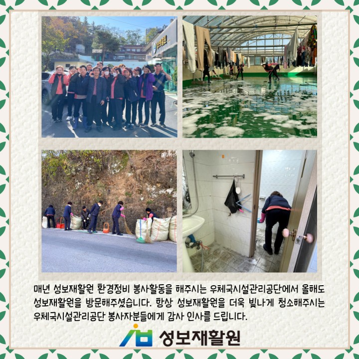 항상 성보재활원을 더욱 빛나게 청소해주시는 우체국시설관리공단 봉사자분들에게 감사 인사를 드립니다.