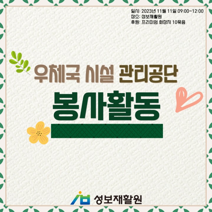 매년 성보재활원 환경정비 봉사활동을 해주시는 우체국시설관리공단에서 올해도 성보재활원을 방문해주셨습니다.
