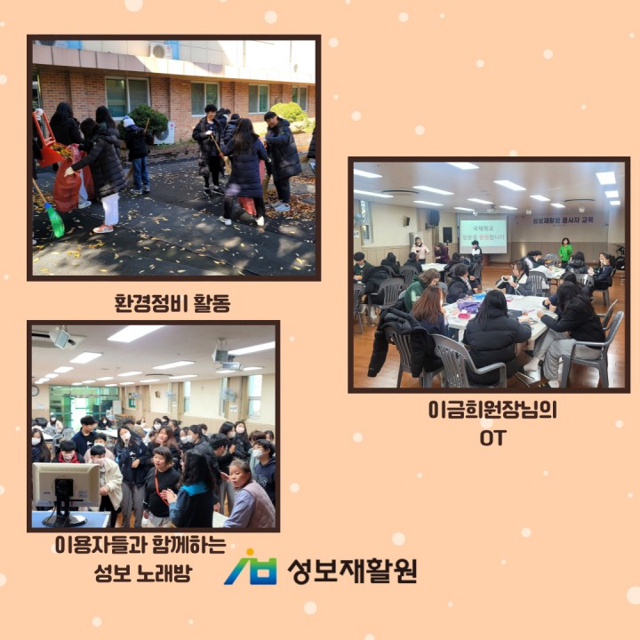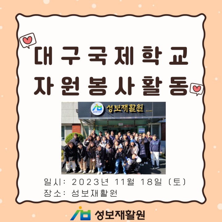 대구국제학교 자원봉사활동 담당자 0 1177 2023.12.22 09:49 대구국제학교 자원봉사활동일시: 2023년 11월 18일 (토)장소: 성보재활원인근에 위치한 대구국제학교 학생들이 성보재활원 이용자들을 위해 봉사활동을 다녀갔습니다.OT를 통한 성보재활원에 대해서 이해하고 이 후에는 이용자들과 함께 노래자랑 프로그램을 진행하였습니다.또한, 성보재활원 앞마당에 쌓인 낙엽 청소활동을 통해 깨끗한 성보재활원을 만들어주었습니다. 감사합니다.