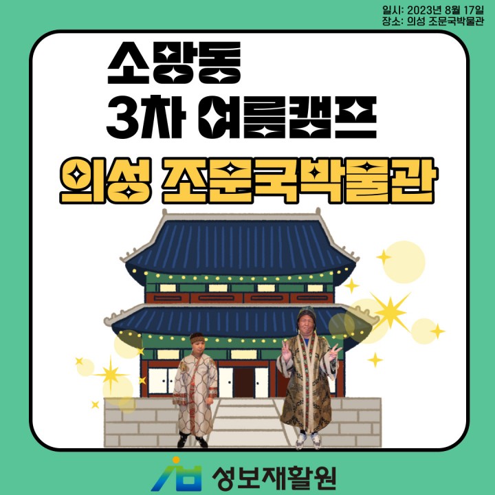 소망동 3차 여름캠프_의성 조문국박물관 담당자 0 1339 2023.08.29 15:08 소망동 3차 여름캠프일시: 2023. 8. 17(목)장소: 의성 조문국박물관소망동 해피룸 이용자들이 뜻깊은 곳으로 여름캠프를 다녀왔습니다.바로 의성에 조문국박물관인데요, 조상님들의 예전 생활 모습과 유물 등을 구경하며 다양한 체험도 즐기고 왔습니다.