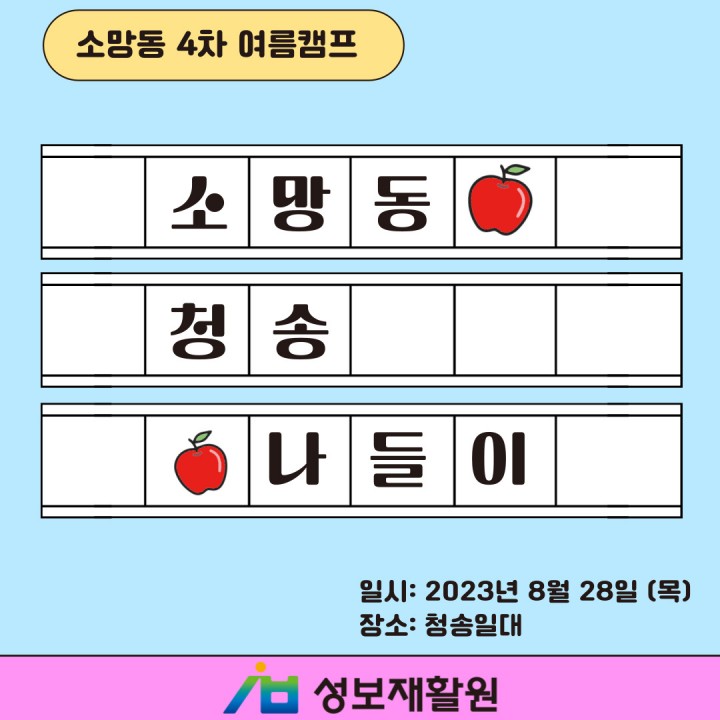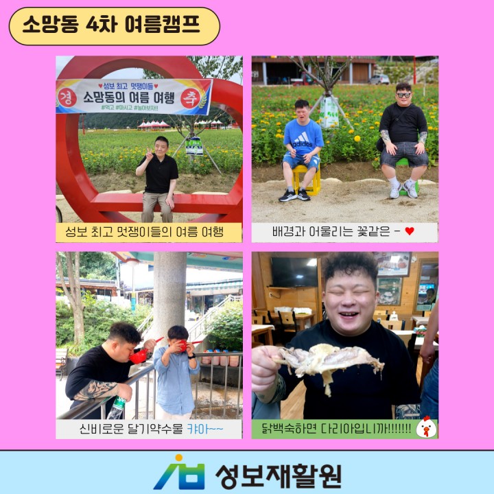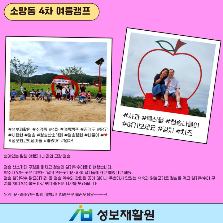 소망동 4차 여름캠프_청송 일대 담당자 0 1666 2023.08.29 15:14 소망동 4차 여름캠프일시: 2023년 8월 28일 월요일장소: 청송 일대숨어있는 힐링 여행지! 사과의 고장 청송청송 산소카페 구경을 마치고 청송의 달기약수터를 다녀왔습니다.약수가 있는 곳은 예부터 '달이 뜨는곳'이라 하여 달기골이라고 불렀다고 해요.청송 달기약수 닭요리거리 등 청송 약수와 관련된 곳이 많아서 주변에서 맛있는 백숙과 닭불고기로 점심을 먹고 달기약수터 구경을 하며 약수물도 마셔보며 즐거운 시간을 보냈습니다.우리나라 숨어있는 힐링 여행지!청송으로 놀러오세요~~~~~!