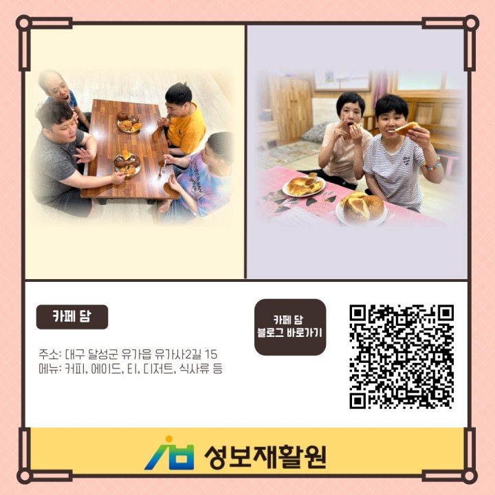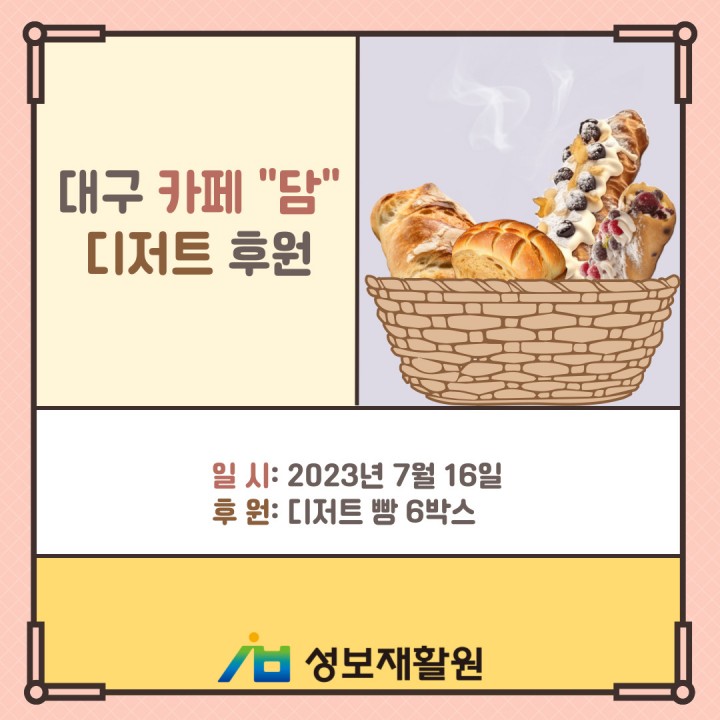 카페 담_디저트 빵 후원 담당자 0 1671 2023.07.20 11:39 성령불꽃선교단의 소개를 통해 대구 송해공원에 위치한 "카페 담"에서 맛있는 디저트 빵을 후원받았습니다. 후원 당일날 맛있게 만들어주신 디저트 빵을 후원해주셔서 감사드립니다.-일시: 2023년 7월 16일-후원: 디저트 빵 6박스