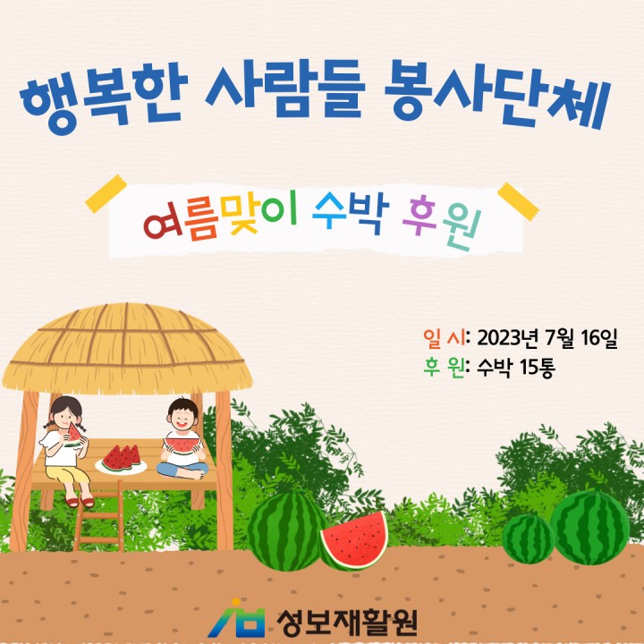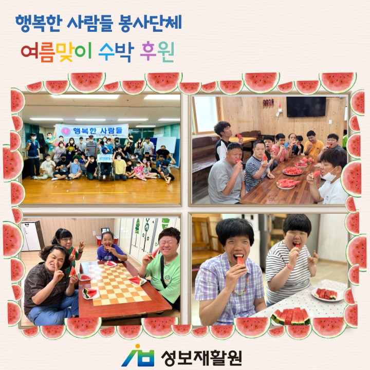 행복한사람들 봉사단체_여름맞이 수박 후원 담당자 0 1467 2023.07.20 11:40 매월 정기 봉사활동 중인 "행복한 사람들" 봉사단체에서 여름맞이 수박을 후원해주셨습니다.행복한사람들 봉사단체는 다양한 재능들을 가지신 직장인으로 구성된 봉사단체로 성보 이용자들의 강변산책, 체육 프로그램활동, 말벗 등 다양한 봉사활동을 진행 중에 있습니다.항상 선한 봉사활동으로 성보재활원에 큰 힘이 되어주셔서 감사드립니다.-일시: 2023년 7월 16일-후원: 수박(大) 15통