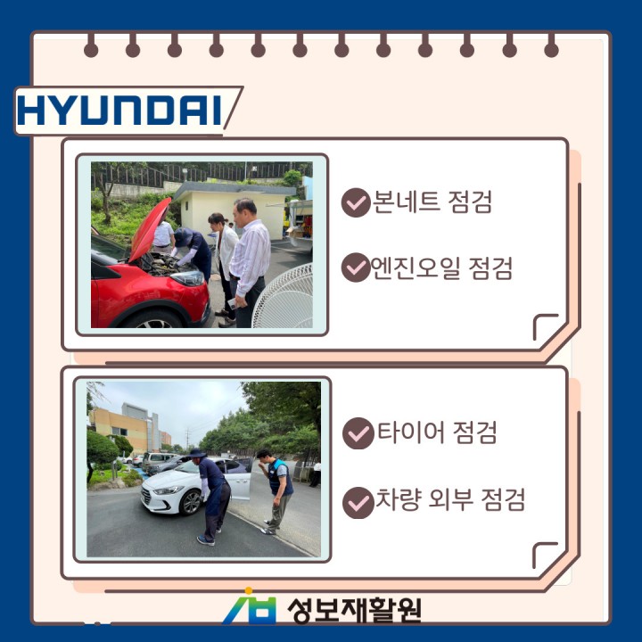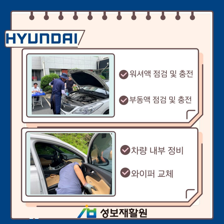 현대자동차 비포서비스 담당자 0 1503 2023.07.24 14:17 현대자동차 소유 직원 대상으로 실시하였으며, 워셔액, 부동액 점검 및 충전, 차량 내부 및 외부 점검, 와이퍼 교체, 본네트 점검, 엔진오일 점검, 타이어 점검까지! 꼼꼼하게 점검을 해주셨습니다. 무더운 날씨에 성보재활원을 방문해주신 현대자동차 직원분들께 다시 한번 더 감사드립니다. - 일시: 2023.07.21.(금)- 장소: 성보재활원 1층 사무실 앞마당