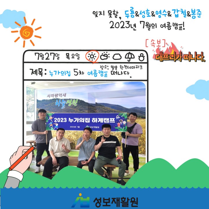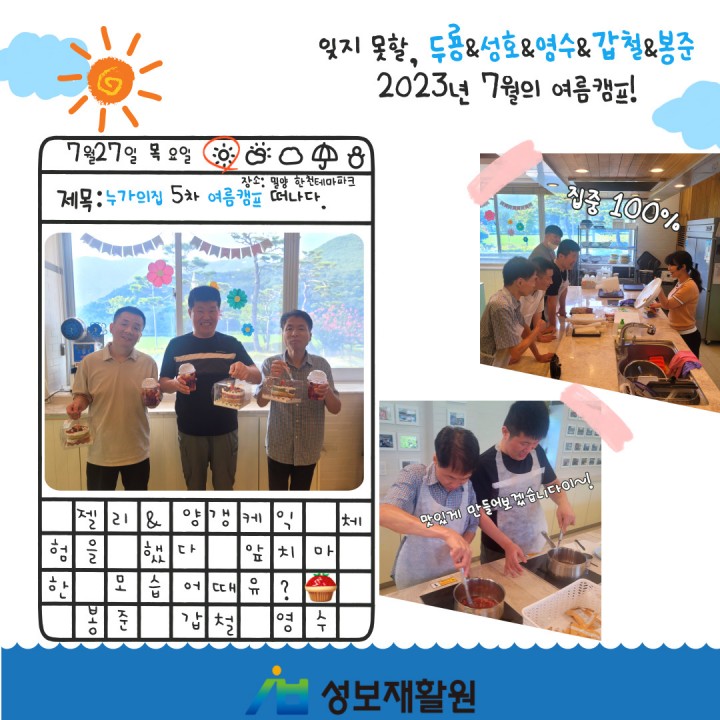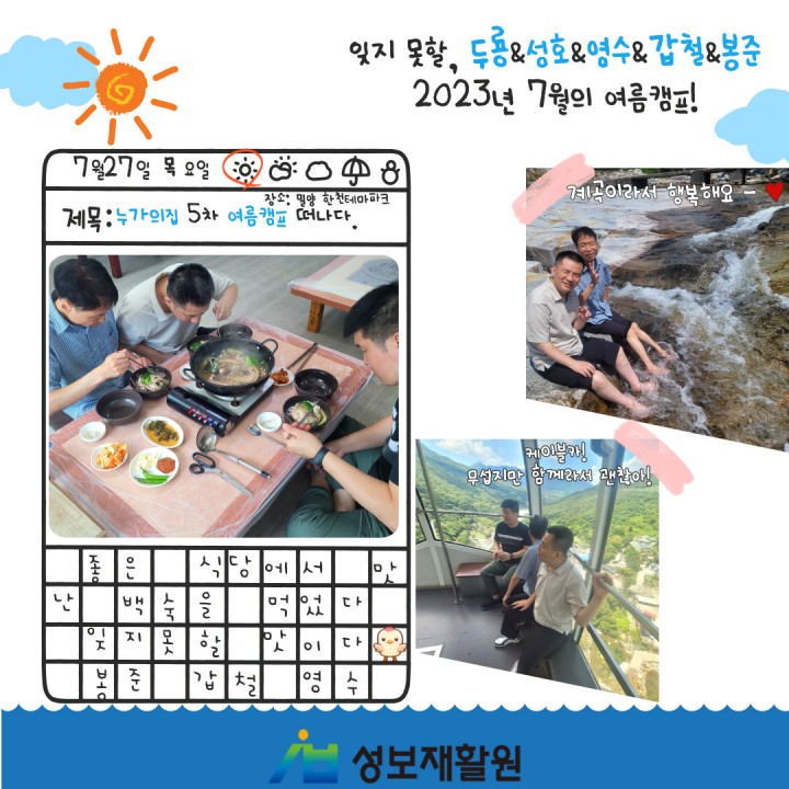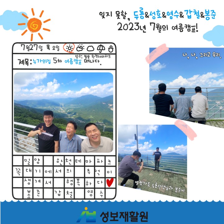 누가의집 5차 여름캠프_밀양 한천 테마파크 담당자 0 1327 2023.08.29 14:59 누가의집 5차 여름캠프일시: 2023. 7. 27. (목)장소: 밀양 한천 테마파크누가의집 이용자들과 직원들이 5차 여름캠프를 다녀왔습니다.인생샷 하나쯤은 건질만한 밀양 한천 테마파크!!!!!!모두들 찐행복해하는 웃음 보이시나요~~??
