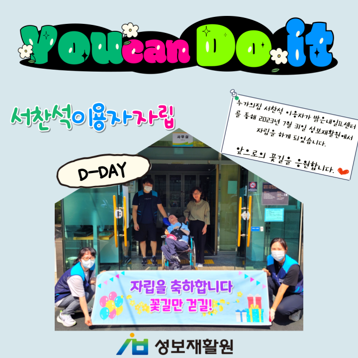 누가의집 서찬석이용자 자립 담당자 0 1385 2023.08.29 15:01 누가의집 서찬석이용자 자립일시: 2023. 7. 31. (월)누가의집 서찬석 이용자가 밝은내일IL센터를 통해 성보재활원에서 자립을 하게 되었습니다.앞으로의 꽃길을 응원합니다.