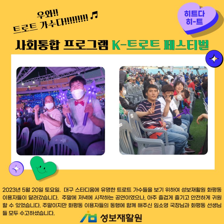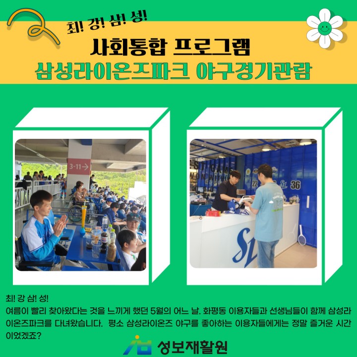 화평동 5월 주요 프로그램 담당자 0 1432 2023.06.22 17:58 성보재활원 화평동 5월 주요 프로그램을 소개합니다.1. 사회통합프로그램-대구 k-트로트 페스티벌2. 사회통합프로그램-삼성라이온즈파크 야구관람