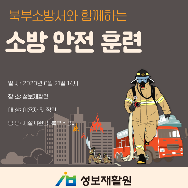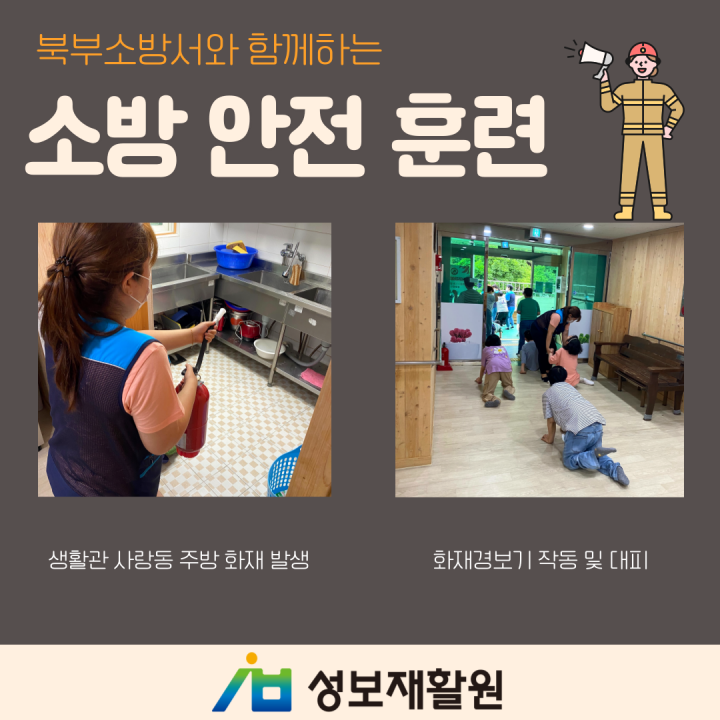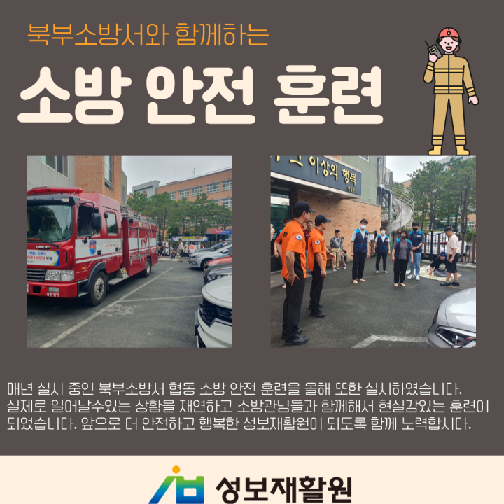 북부소방서와 함께하는 소방 안전 훈련 담당자 0 1345 2023.06.22 18:13 2023년 6월 21일북부소방서와 함께하는 소방 안전 훈련을 실시했습니다. 매년 실시 중인 북부소방서 협동 소방 안전 훈련은 실제로 일어날수있는 상황을 재연하고 소방관님들과 함께해서 현실감있는 훈련이 되었습니다. 앞으로 더 안전하고 행복한 성보재활원이 되도록 함께 노력합시다.