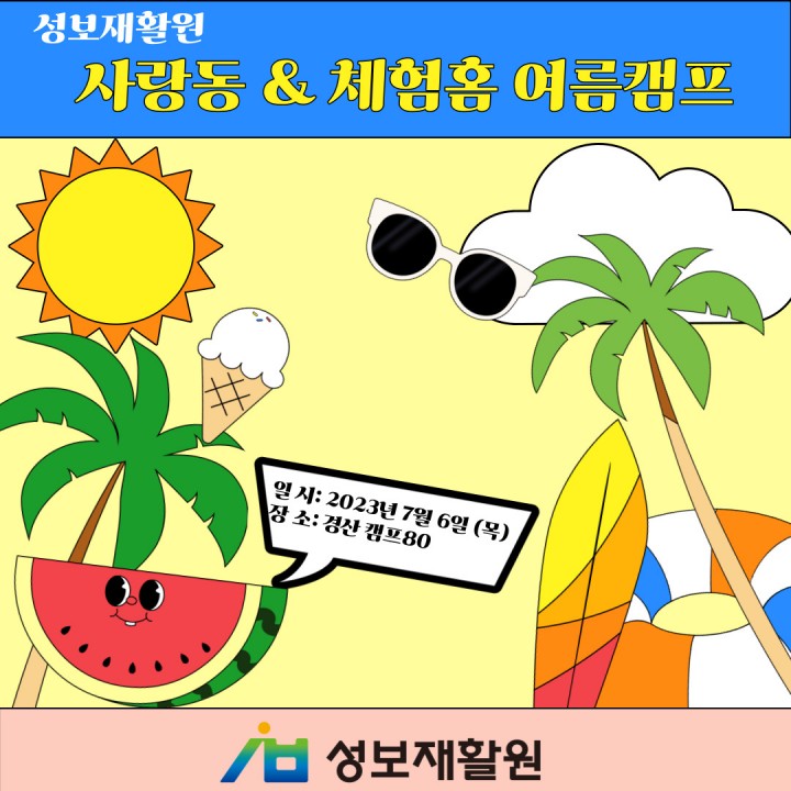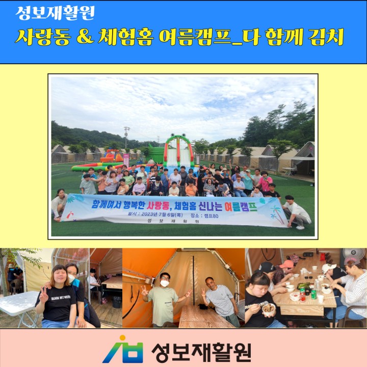 사랑동&체험홈 여름캠프_캠프80 담당자 0 1693 2023.07.19 16:33 사랑동 & 체험홈 이용자 여름캠프경산에 위치한 캠프80이라는 곳에 여름캠프를 다녀왔습니다.고기파티, 라면파티, 버블 물놀이도 하며 신나는 시간을 보냈답니다.- 일시: 2023년 7월 6일 (목)- 장소: 캠프80