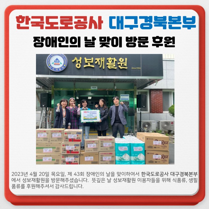 한국도로공사 대구경북본부 방문 후원 담당자 0 1316 2023.04.24 17:14 2023년 4월 20일 목요일, 제 43회 장애인의 날을 맞이하여서 한국도로공사 대구경북본부에서 성보재활원을 방문해주셨습니다.뜻깊은 날 성보재활원 이용자들을 위해 식품류와 생필품류를 후원해주셨습니다. ❤️감사드립니다.- 일 시 : 2023년 4월 20일 (목)- 후원품 : 100만원 상당의 식품류 및 생필품류