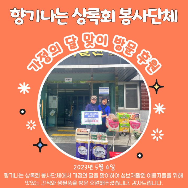 2023년 향기나는 상록회 봉사단체_가정의 달 맞이 방문 후원 담당자 0 1392 2023.06.05 17:40 향기나는 상록회 봉사단체에서 가정의 달을 맞이하여 성보재활원 이용자들을위해 맛있는 간식와 생필픔을 방문 후원해주셨습니다.아낌없는 관심과 나눔에 감사드립니다. - 일 시 : 2023년 5월 4일 (목)- 후원품 : 식품류 및 생필품류 30만원 상당