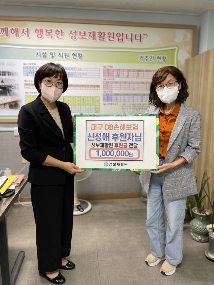 2022년 대구 DB손해보험 신성애 후원자님 방문 후원 담당자 0 2184 2022.10.07 14:34 성보재활원 이용자들을 위해서 신성애 후원자님께서 일시금 1,000,000원을 후원해주셨습니다.성보재활원 소식지를 보시고 성보재활원을 방문해주셨다는신성애 후원자님의 따뜻한 마음을 잊지 않겠습니다.감사드립니다.- 일 시 : 2022년 9월 6일- 후원금 : 일시금 1,000,000원