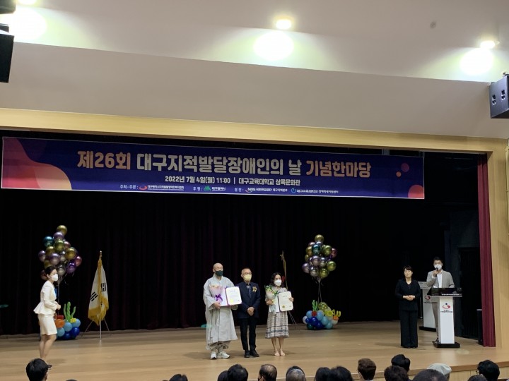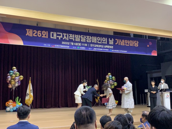 제26회 대구지적발달장애인의 날 기념한마당 참석 및 유공자 포상 담당자 0 2705 2022.08.04 16:54 제26회를 맞이한 대구지적발달장애인의 날의 행사에 이용자들과 함께 참석하였습니다.또한 성보재활원 송언민 믿음동 선생님이 대구광역시 시장상을 수상하였습니다.짝!짝!짝!축하드립니다.- 일 시 : 2022년 7월 4일- 장 소 : 대구교육원- 참석자 : 이금희 원장, 임소영 사무국장, 송언민 믿음동 생활재활교사, 문송이 자원봉사후원담당전은희, 정혜진, 권말숙 이용자