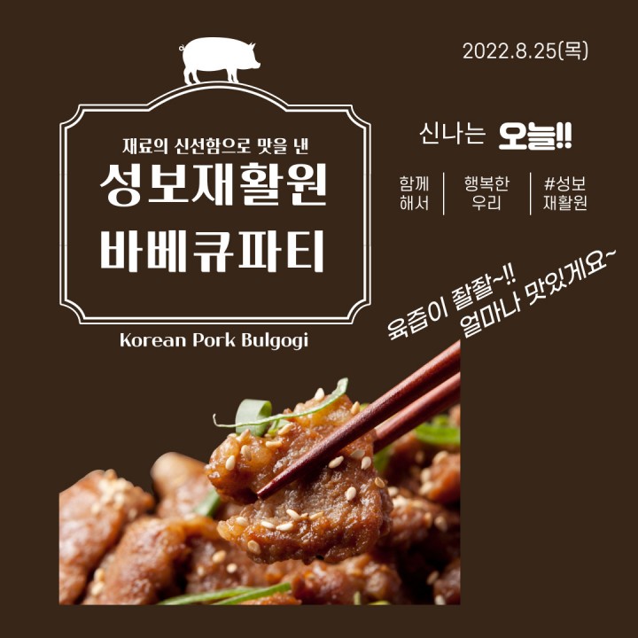 2022년 성보 고기 파티 담당자 0 1956 2022.10.07 14:02 각 생활관별로 맛있는 고기 파티가 열렸습니다!육즙이 살아 있는 맛있는 삼겹살~~ 소고기~~~직원들이 구워줘서 더 맛있었던 고기 파티였습니다.모두 고생하셨습니다.- 일 시 : 2022년 8월 25일- 장 소 : 성보재활원 각 생활관
