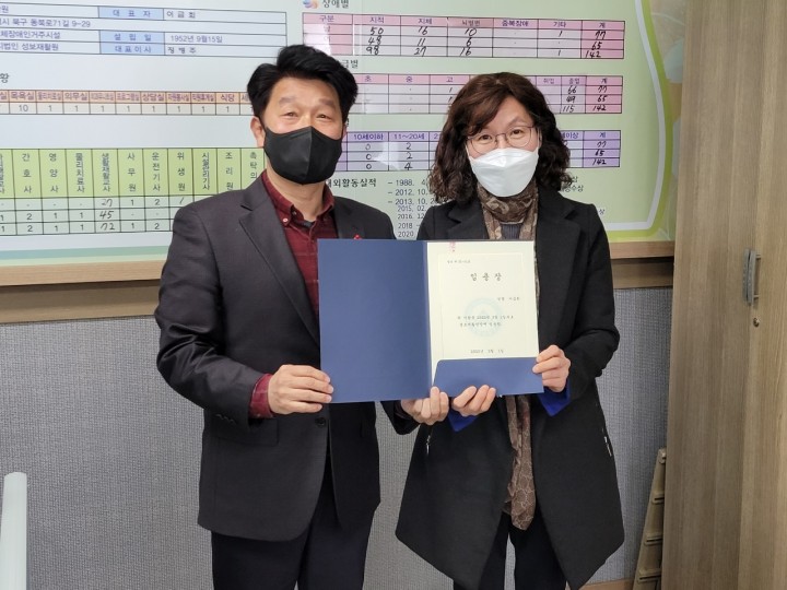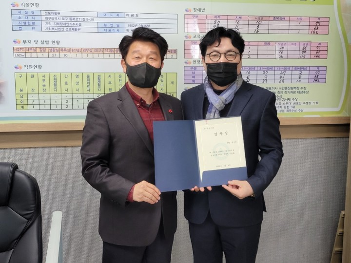 22년 제12대 이금희 성보재활원 원장, 권영욱 사회복지법인 성보보호작업장원장 취임식 담당자 0 3048 2022.03.02 15:33 제12대 이금희 성보재활원 원장, 권영욱 사회복지법인 성보보호작업장원장 취임식을 가졌습니다.코로나19로 인하여 비대면으로 취임식을 진행하였습니다.축하드립니다. ^_^- 일 시 : 2022년 3월 2일 (수)- 장 소 : 성보재활원 원장실 및 자원봉사자실- 진행자 : 임소영 국장- 참석자 : 정병주 대표이사, 이금희 성보재활원 원장, 권영욱 사회복지법인 성보작업장원장, 임소영 국장