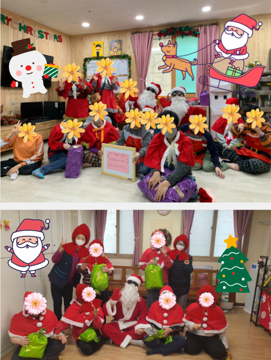 2021년 크리스마스 행사(1) 담당자 0 2620 2021.12.27 09:46 올 해도 어김없이 성보재활원에 산타할아버지가 나타났어요 ~ ♥크리스마스 이브를 맞이하여 성보재활원에서 크리스마스 자체 행사를 진행하였습니다.산타할아버지를 보고 함박웃음을 짓는 성보재활원 이용자들을 보니, 동심으로 돌아간 것 같았습니다.산타할아버지 대역을 해주신 김호정, 박재균 선생님 고생하셨습니다.모두들 Merry Christmas- 일 시 : 2021년 12월 24일 (금)- 장 소 : 각 생활관- 협조자 : 사회재활팀, 생활재활팀