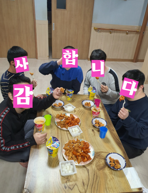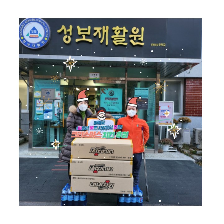 2021년 크리스마스 맞이 마예모(마음이 예쁜 사람들의 모임) 방문 후원 담당자 0 2195 2021.12.27 10:52 마예모 (마음이 예쁜 사람들의 모임) 후원 단체에서크리스마스을 맞이하여 성보재활원에 맛있는 순살 치킨을 후원해주셨습니다.마예모 후원자님들 덕분에 따뜻한 크리스마스를 보냈습니다.♥ 감사드립니다. ♥- 일 시 : 2021년 12월 25일 (토)- 후원품 : 치킨 순살 세트 50, 콜라