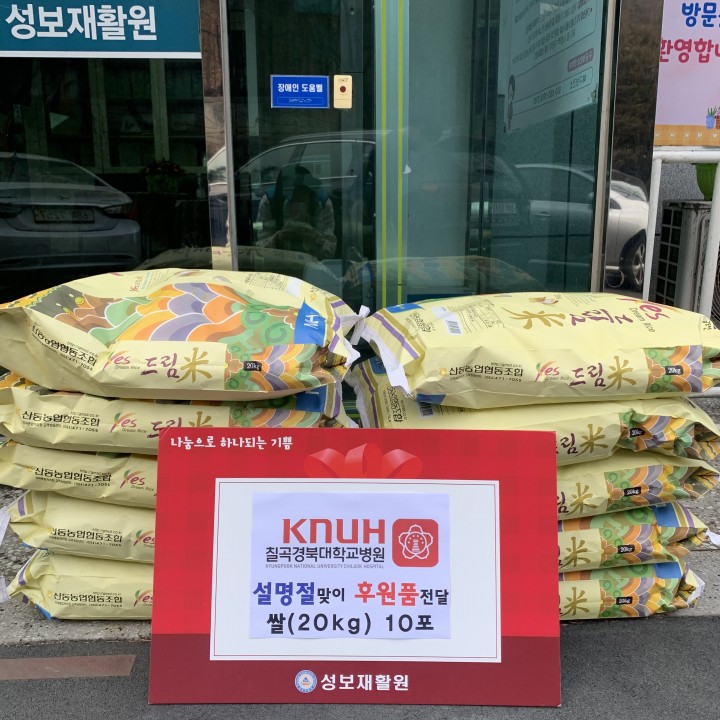 2022년 설명절맞이 칠곡경북대학교병원 후원 담당자 0 2008 2022.01.27 18:01 매년 명절 때 마다 후원해주시는 칠곡경북대학교병원에서 올 설에도 맛있는 쌀을 후원해주셨습니다.항상 잊지 않고 성보재활원 이용자들을 위하여 후원해주셔서 감사드립니다.♥ 새해 복 많이 받으세요. ♥- 일 시 : 2022년 1월 24일 (월)- 후원품 : 쌀(20kg) 10포
