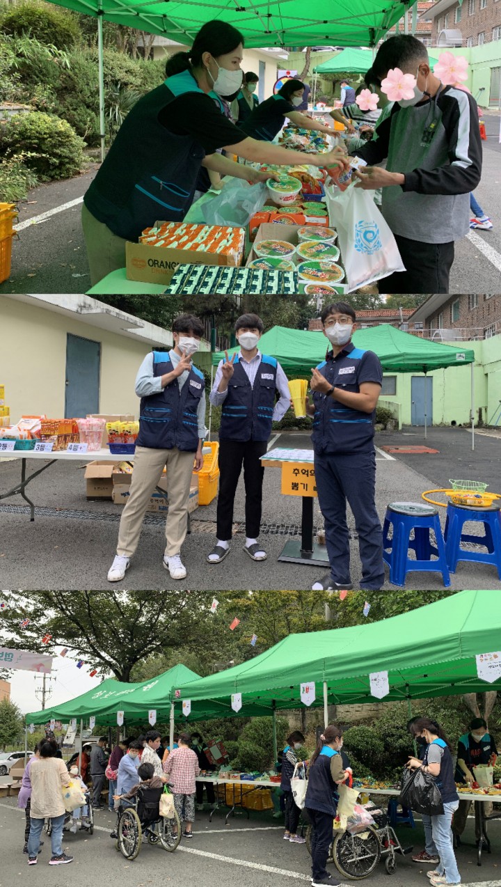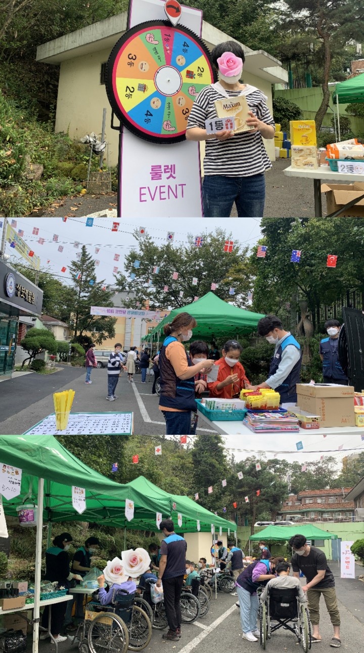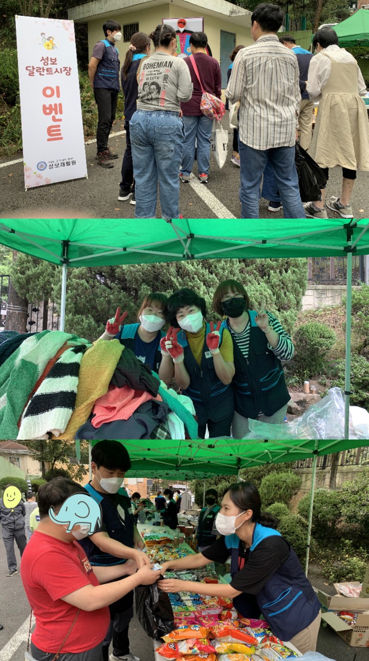 2021년 성보재활원 달란트 시장 행사 담당자 0 3002 2021.10.23 10:35 푸른 가을 하늘아래. 성보재활원에서 달란트 시장이 열렸습니다.코로나19로 적막했던 성보재활원에 사람들로 북적이며 오랜만에 활기찬 모습을 보였습니다.내년에는 마스크 벗GO 만나요 ! ❤- 일 시 : 2021년 10월 15일 (금)- 장 소 : 성보재활원 앞마당- 참여자 : 성보재활원 이용자 및 직원- 지원팀 : 사회재활팀, 생활재활팀, 기획행정팀* 코로나19 예방수칙 및 거리두기를 지키며 행사를 진행함.