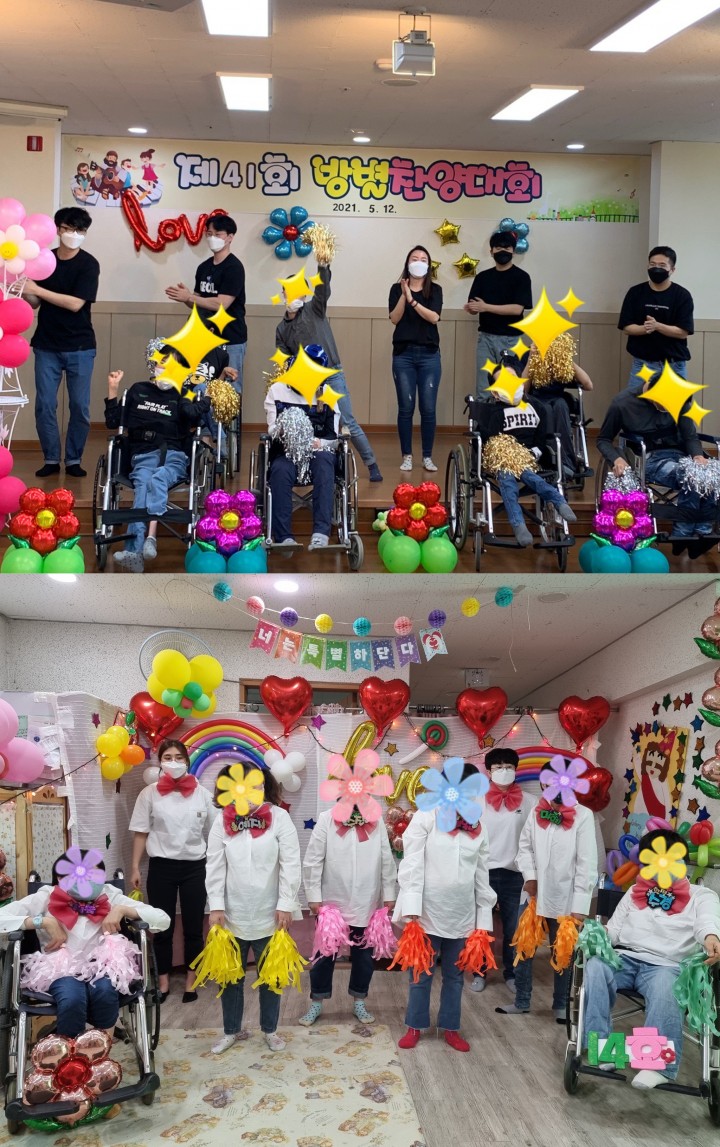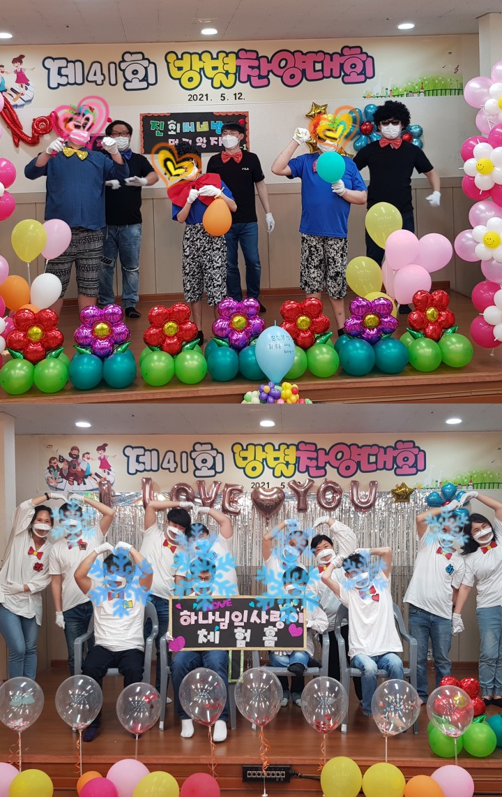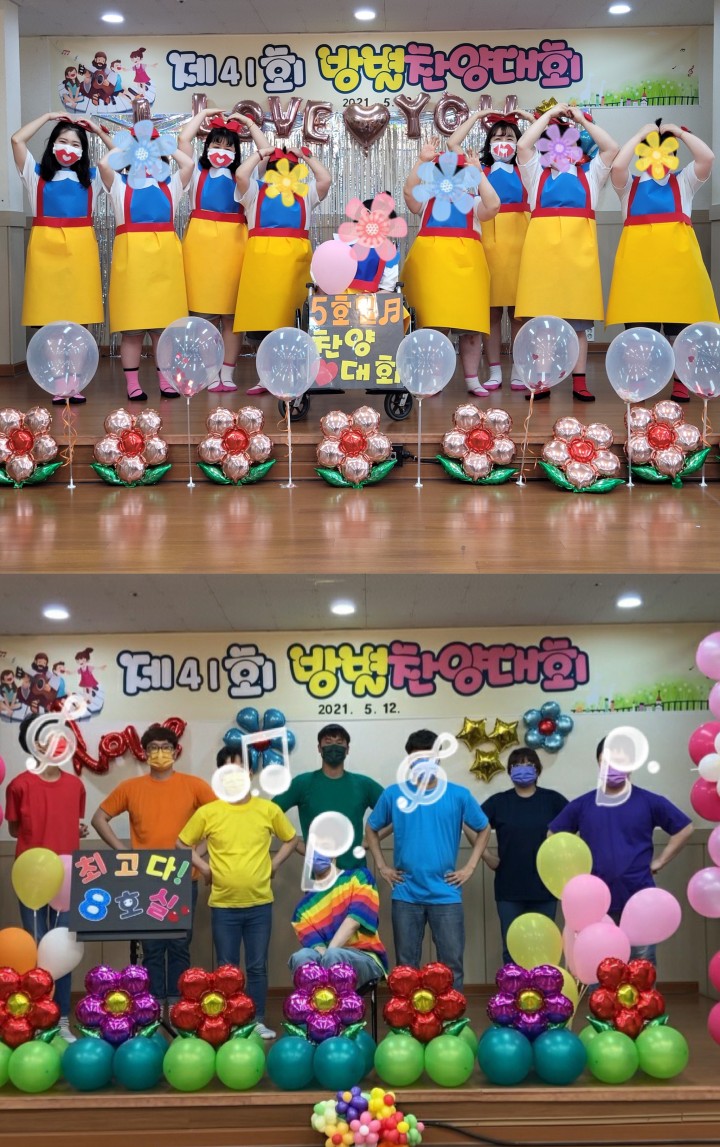 2021년 방별찬양대회 담당자 0 2389 2021.05.21 14:34 올 해도 코로나19로 인하여 방별찬양대회는 각 방별로 촬영을 하여 심사를 받는 방법으로소규모로 진행되었습니다. 행사를 준비해주신 직원분들과 이용자들 모두 고생 많으셨습니다.내년에는 마스크 벗GO 만나요. ❤( ˘ ³˘) ♥
