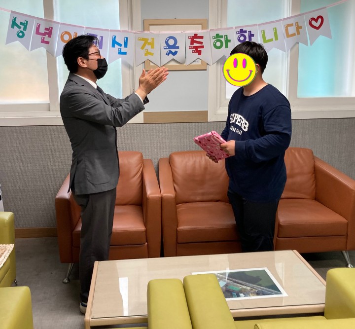 2021년 성년의 날 행사 담당자 0 2284 2021.05.21 14:51 성년의 날을 맞이한 성보재활원의 이용자에게 축하하는 소규모의 행사를 진행하였습니다.성년이 된 것을 축하드립니다. ❁ ❛ᴗ❛ ❁- 일 시 : 2021년 5월 17일 (월)- 장 소 : 원장실- 협조자 : 사회재활팀- 이용자 : 화평동 이영진