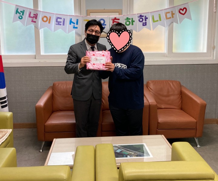 2021년 성년의 날 행사 담당자 0 2292 2021.05.21 14:51 성년의 날을 맞이한 성보재활원의 이용자에게 축하하는 소규모의 행사를 진행하였습니다.성년이 된 것을 축하드립니다. ❁ ❛ᴗ❛ ❁- 일 시 : 2021년 5월 17일 (월)- 장 소 : 원장실- 협조자 : 사회재활팀- 이용자 : 화평동 이영진